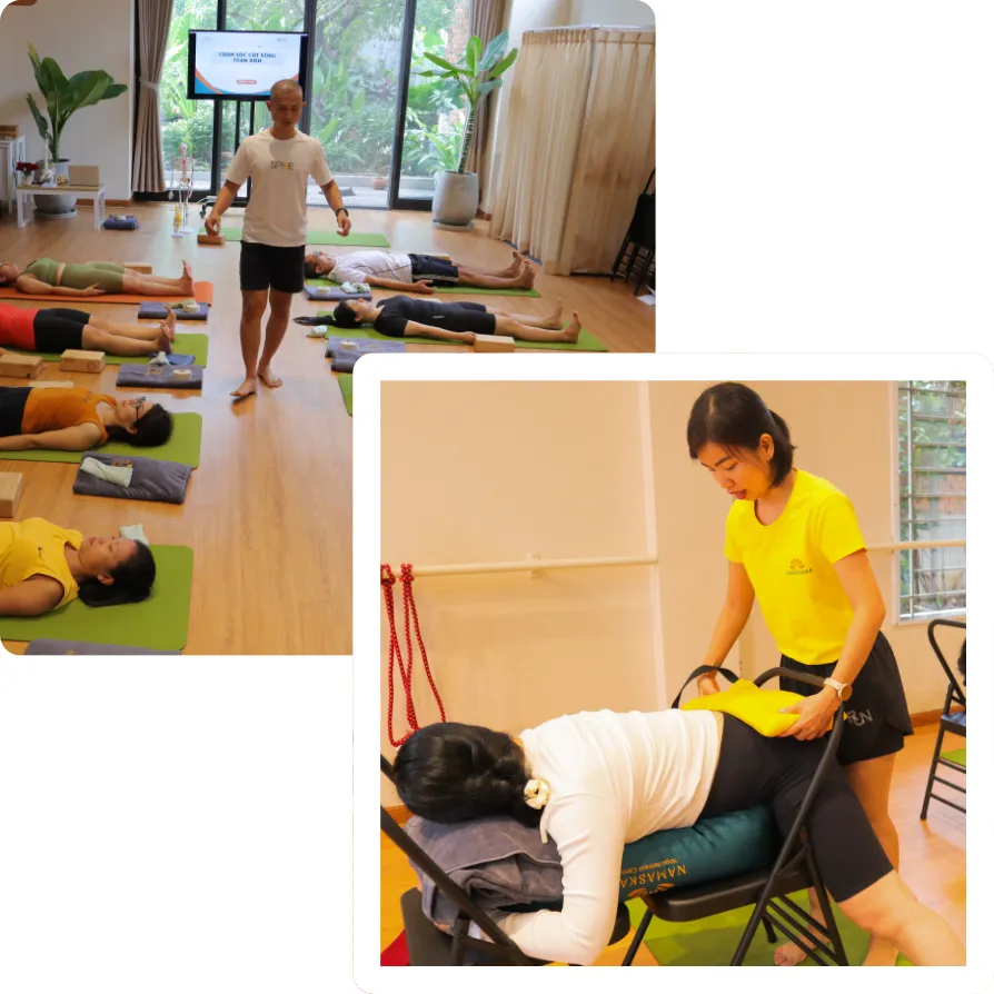 Không cần phải linh hoạt để bắt đầu. Các khóa học của Namaskar, đặc biệt là SPINE™, được thiết kế với nhiều Props (dụng cụ) và quy trình tập luyện theo logic của khoa học vận động, để hỗ trợ mọi cấp độ, kể cả người mới và những ai có vấn đề về cột sống lâu năm.